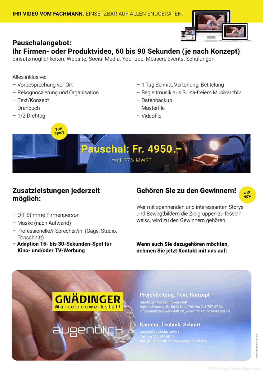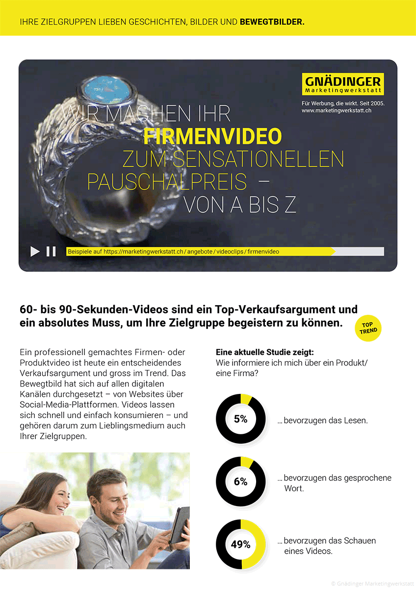 Ein professionell gemachtes Firmen- oder Produktvideo ist heute ein entscheidendes Verkaufsargument und gross im Trend. Das Bewegtbild hat sich auf allen digitalen Kanälen durchgesetzt – von Websites über Social-Media-Plattformen. Videos lassen sich schnell und einfach konsumieren – und gehören darum zum Lieblingsmedium auch Ihrer Zielgruppen.